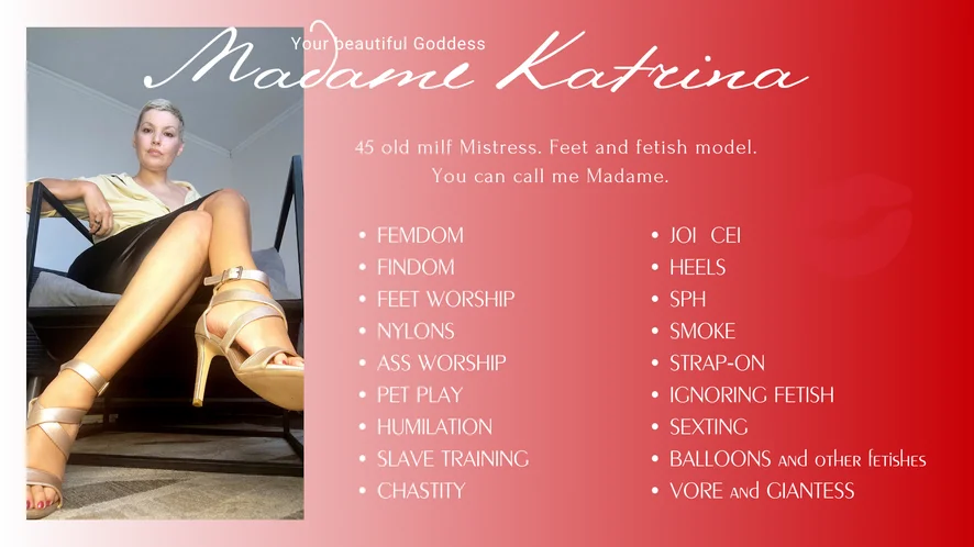 Fetiche por Pés, Tacões, Couro, Fumar, Escritório, Classificação de Paus, Instruções para Bater Uma, Nylon, Role Play, Dominadora, Conversa porca, Corno, Humilhação, Strapon, Topless, Pegging